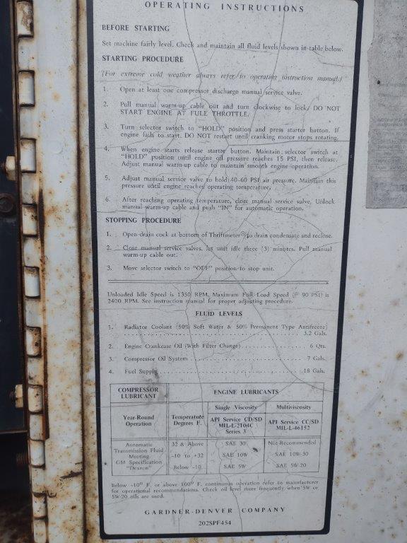 Item ID: 261866 1 Offered at Best Price Mobile Air Compressor Located in Midland, MIGardner Denver 150Diesel engine and air compressor,Engine hard to startDow Unit 7562HOURS OF OPERATION: 7:00am - 5:30pm EST, Mon - ThursContact: David Callahan Office: (989) 633-0985 email: dcallahan@dow.comSold As-Is, Where-IsBidding Closes on Dow’s acceptance of a qualifying bidSealed Bidding starts at $300DOW RESERVES THE RIGHT TO REJECT ANY AND/OR ALL BIDSLOAD OUT: This lot will be loaded onto buyer's truck free of charge. Buyer is responsible for securing the load and logistics ... other images Location: Midland, Michigan, United States Unit Price Unstated Number of Units 1 Make OFFERCONTACT Me