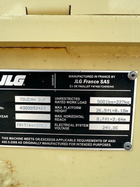Item ID: 262240 1 Offered at Best Price 2013 JLG Toucan 26E 2013 JLG Toucan 26E personal lift. The batteries went bad and the unit has been sitting for a couple of years. Location: Orange, TX Sold “As Is-Where Is” with no warranties or liabilities. Dow recommends viewing to make your own determination of condition.Bidding closes on Dow’s acceptance of a qualifying bidDOW RESERVES THE RIGHT TO REJECT ANY AND/OR ALL BIDSLOAD OUT: Buyer is responsible for loading, securing the load, and logistics. ... other images Location: Orange, Texas, United States Unit Price Unstated Number of Units 1 Model JLG Toucan 26E Description 26' personal lift Year of Manufacture 2013 Condition Fair Shipping & Handling:All Items are sold FOB our warehouse. We are not responsible for any damage incurred during shipment. It is the buyers responsibility to inspect packages for damage and to note damage on bills of lading. Payment:Fortune 500 companies, net 30, with purchase order. Colleges and universities, net 30, with purchase order. Federal, state, local governments, and their agencies, net 30, with purchase order. Companies having previously established credit with us, net 30, with purchase order. All others, prepayment or COD (cashier's check) required Make OFFERCONTACT Me